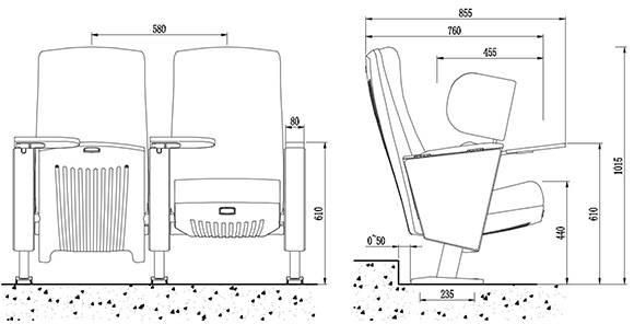 2.座椅基本中心距为580±5mm,座包打开侧深760±5mm,写字板打开侧深855±5mm,基本椅高为1015±5mm,最小排距:900mm。