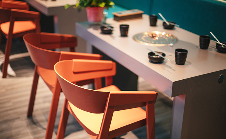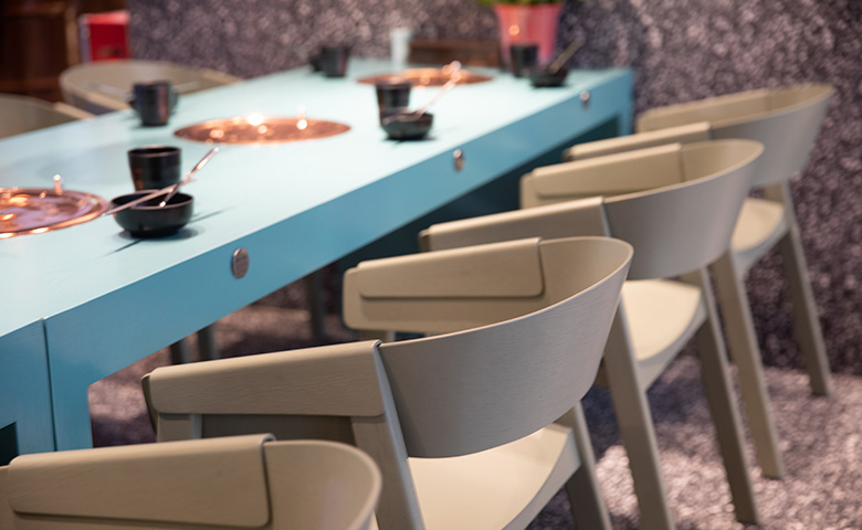 采用三朗曲木椅系列产品,整体按区撞色设计,秀食可餐。