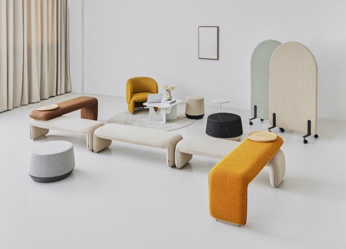 大象系列是以动物形象为题,表达出一种对大自然的热爱以及童趣的一款产品。设计师提炼出大象巨大的耳朵、肚子、厚实的背部等特点运用到了家具的软体上,整体给人一种亲切活泼,憨态可掬,包裹感强,安全感十足的感受。 从使用方面衍生出座墩,长凳,休闲椅等应用空间极大的产品。它的各模块通过灵活的组合搭配,形成休闲空间、讨论空间、过道空间、角落空间等等,俏皮可爱的大象瞬间成为空间内的视觉亮点。